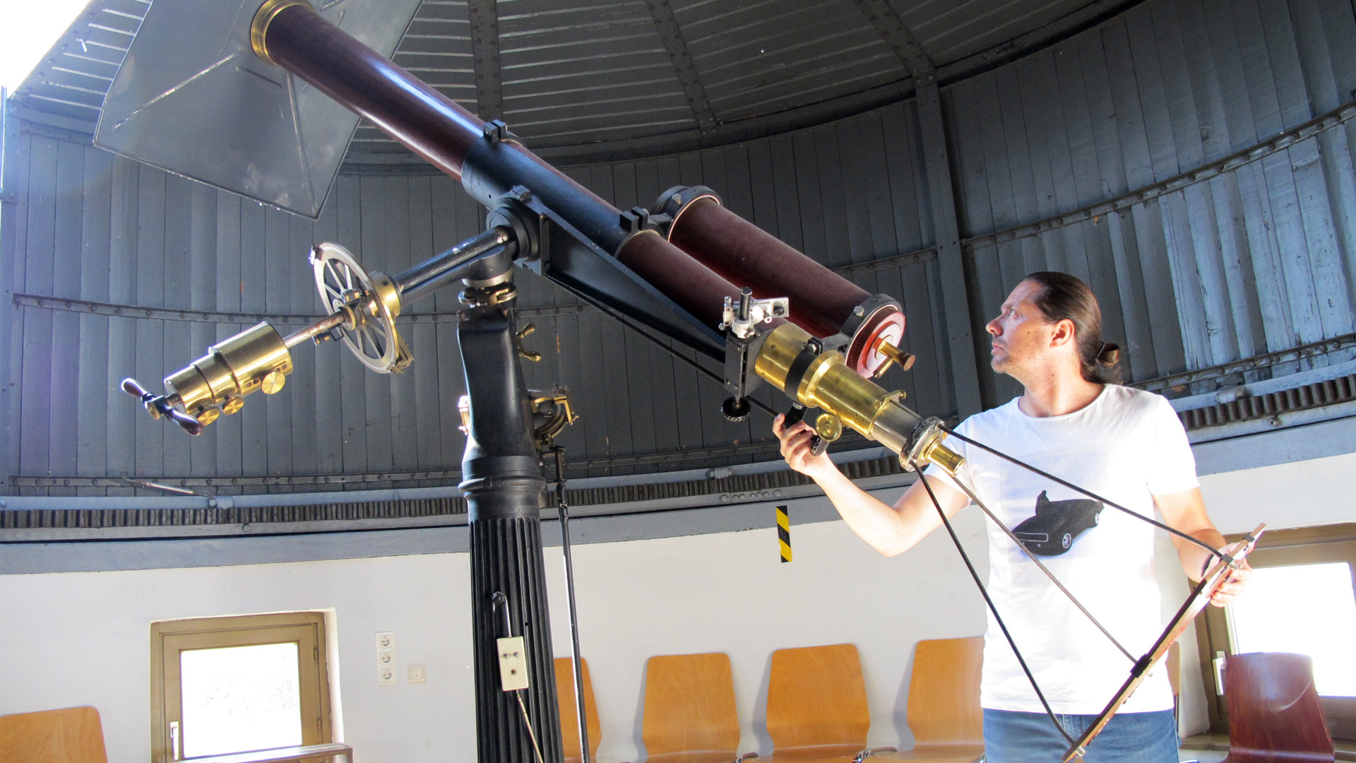 Großen Anklang fanden auch die Führungen auf den Astronomischen Turm der Universität Graz. Bei strahlendem Sonnenschein gab es eine Einführung zum Thema Sonnenphysik und der Blick durch das historische Fernrohr brachte die Sonne zum Greifen nahe.