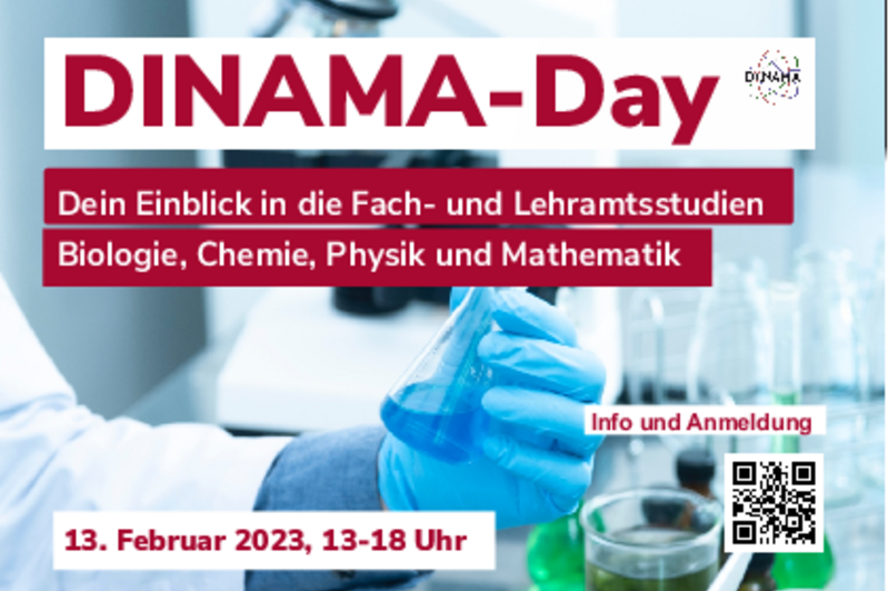 Interessierte Schüler:innen der DINAMA-Kooperationsschulen ab der 11. Schulstufe haben am DINAMA-Day am 13.2.2023 die Möglichkeit einen Einblick in die Fach- und Lehramtsstudienrichtungen Biologie, Chemie, Physik und Mathematik zu bekommen. Dabei gibt es die Möglichkeit an Probevorlesungen, Institutsführungen und Laborübungen teilzunehmen.